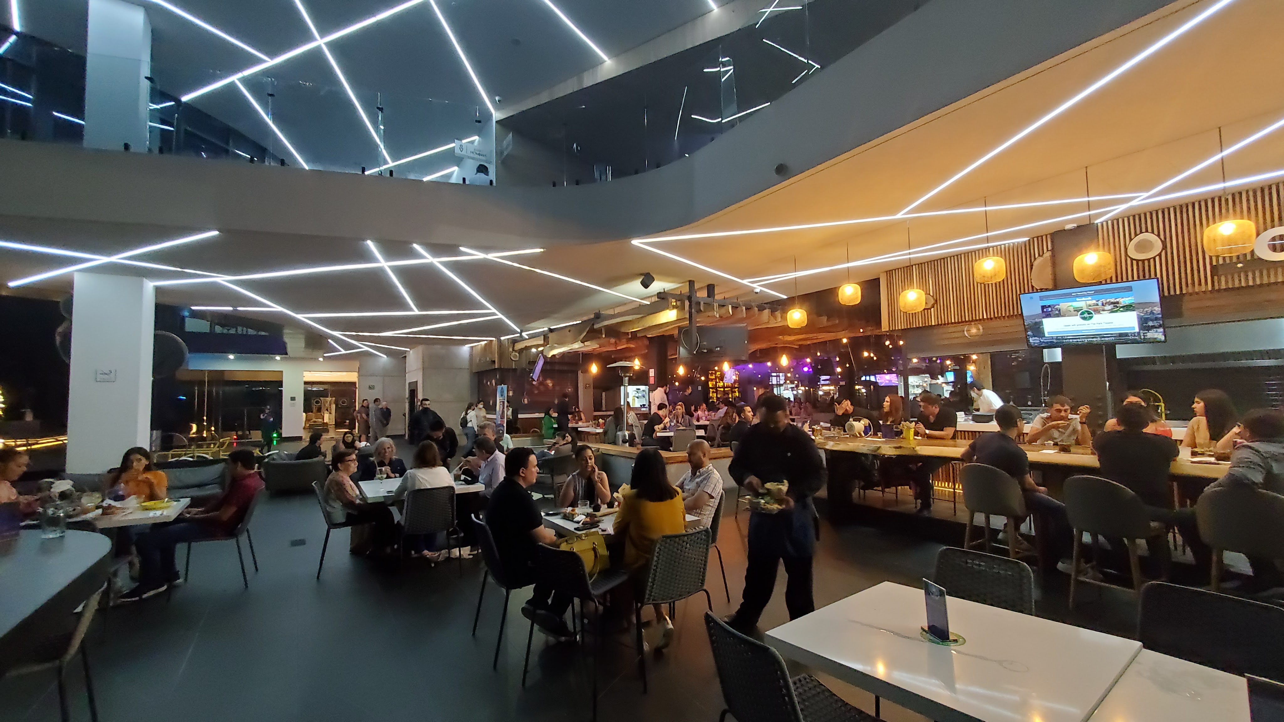 The court is open air on one side and more enclosed on the other, and it’s very contemporary in design. The varied lighting gives the place a very contemporary night club feel to it. It can be a bit on the loud side, so if you think you’re going to be able to whisper sweet nothings into your partner’s ear between courses, think again. Probably not the place for that.